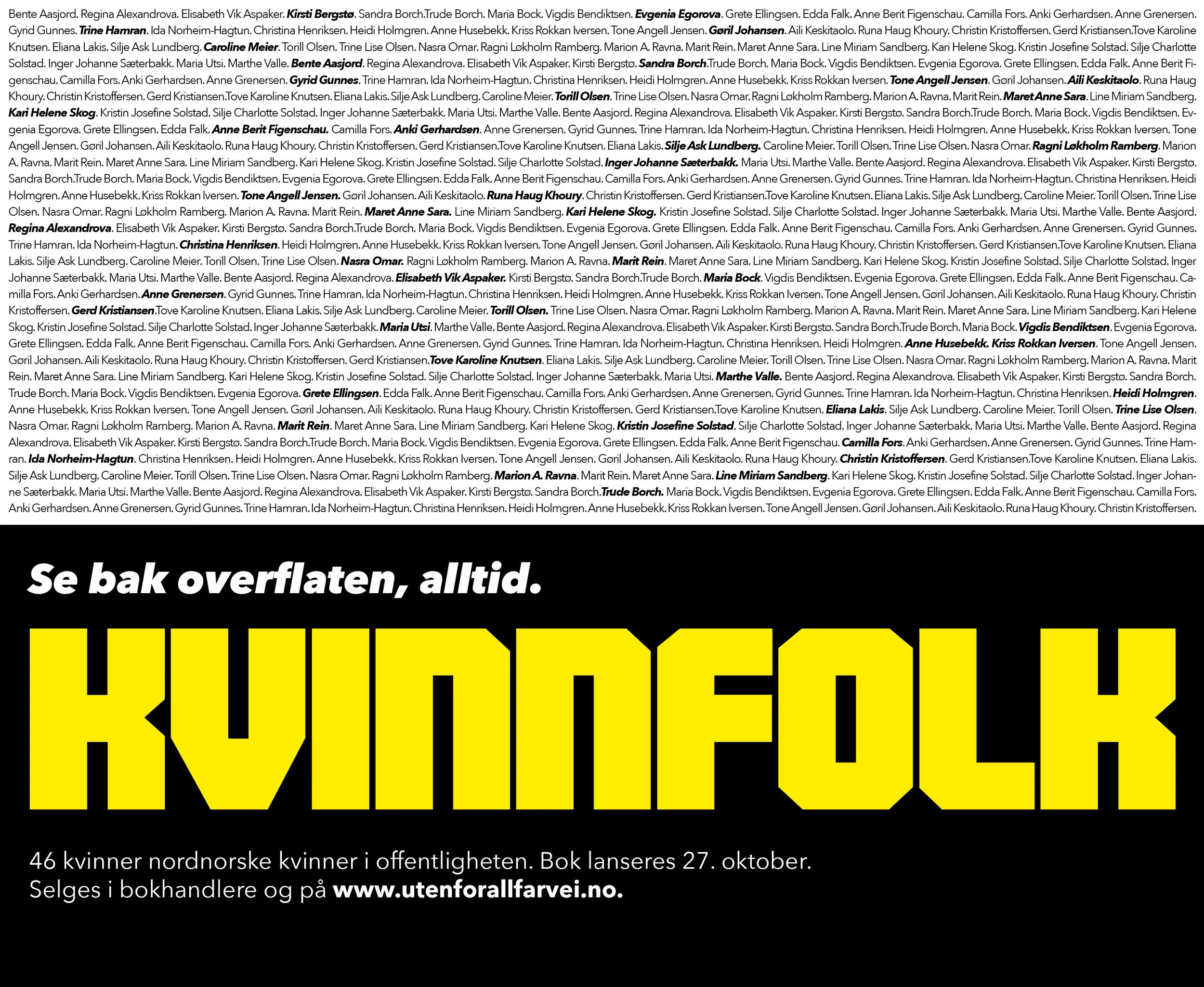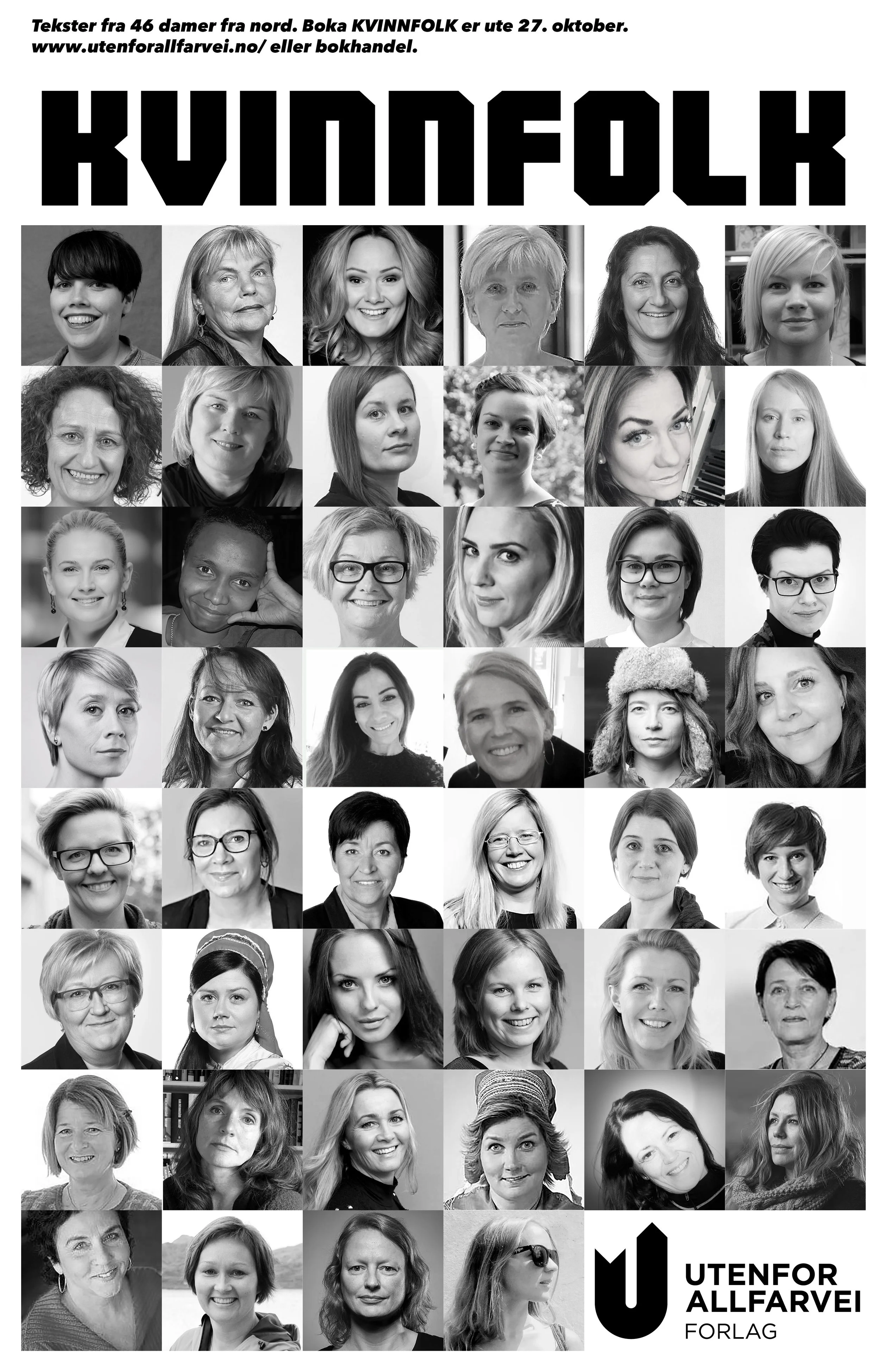 Redaktør Christine Kristoffersen Hansen har samlet 46 kvinner fra Nord-Norge i en bok. Dette er kvinner som jevnlig ytrer seg i offentligheten gjennom kronikkspalter, blogger, og nettsteder. En del av tekstene har vært publisert tidligere. Alle tekstene er fra det siste året, og speiler hva (nordnorske) kvinner er opptatt av i dag. Og det er mye. Det er en stor glede for oss å løfte frem disse tøffe og talentfulle kvinnene som på tross av usaklige spydigheter fra nettroll som er mer opptatt av utsiden enn av innsiden, stadig tør å si hva de mener.